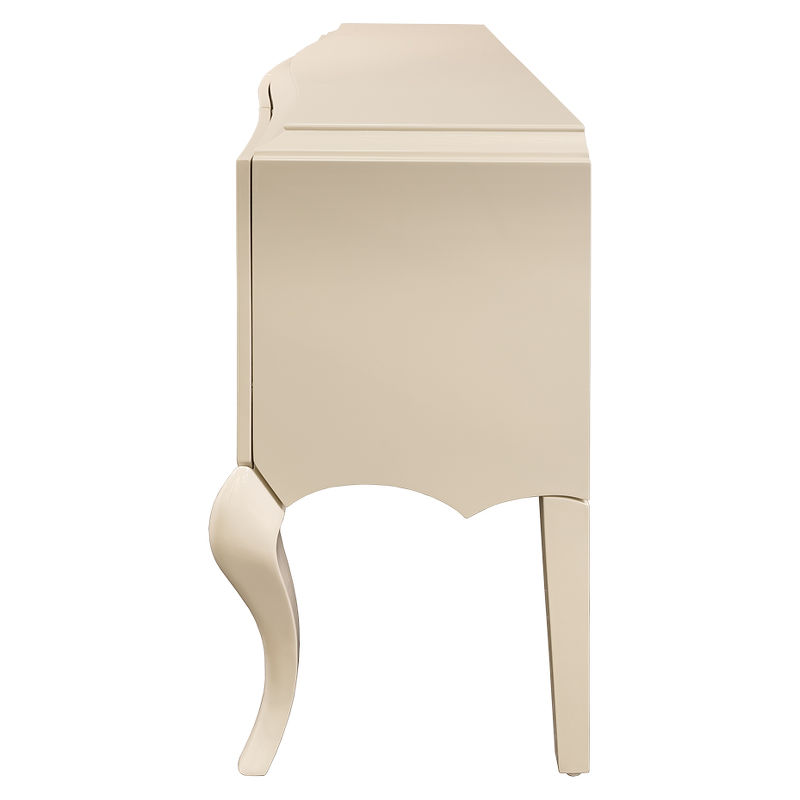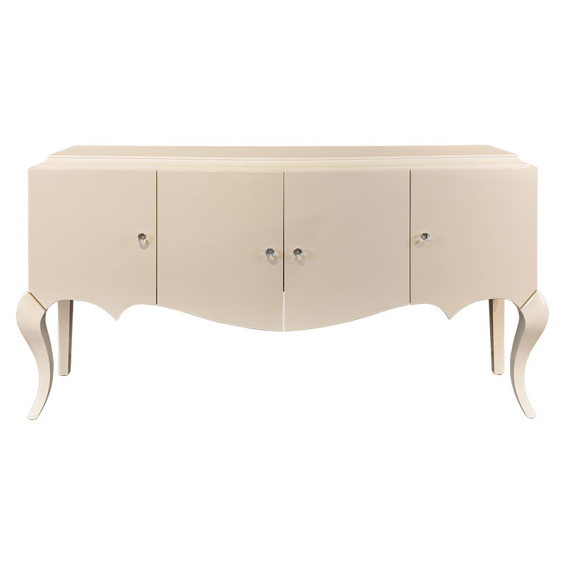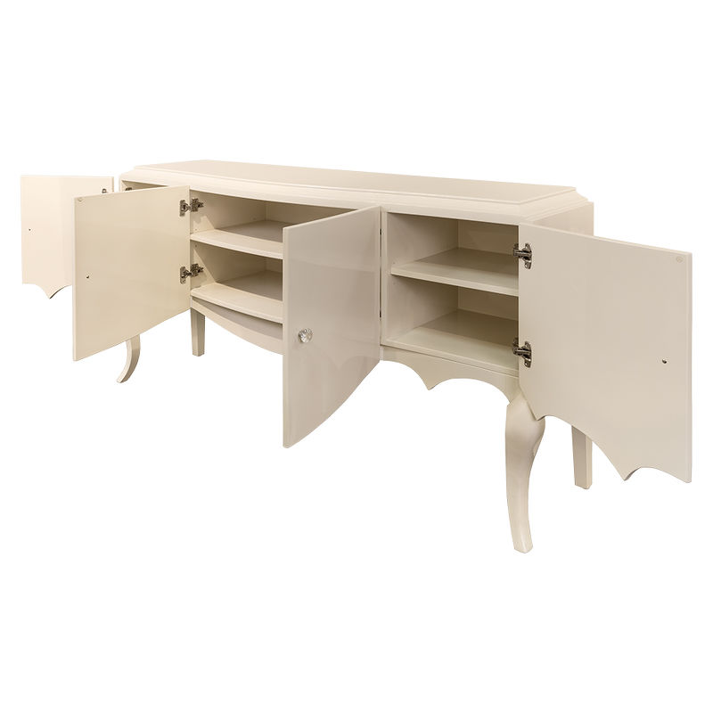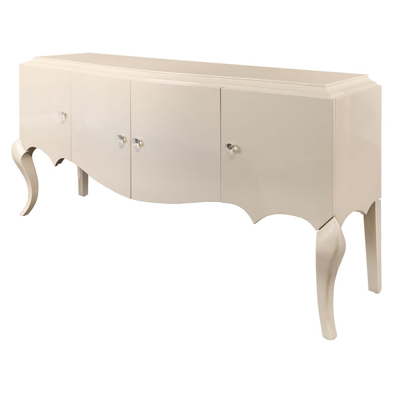 Cupboard with curved front and curly legs made in Art-deco style. Finished in sparkle pearl lacquer. Designed for the dishware. Right after four swing doors you can find one shelf in each niche (in the middle). The height of each niche is 39,2.