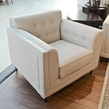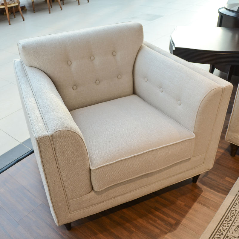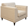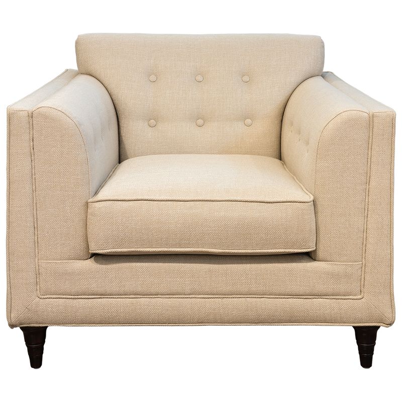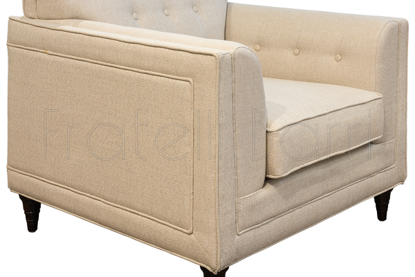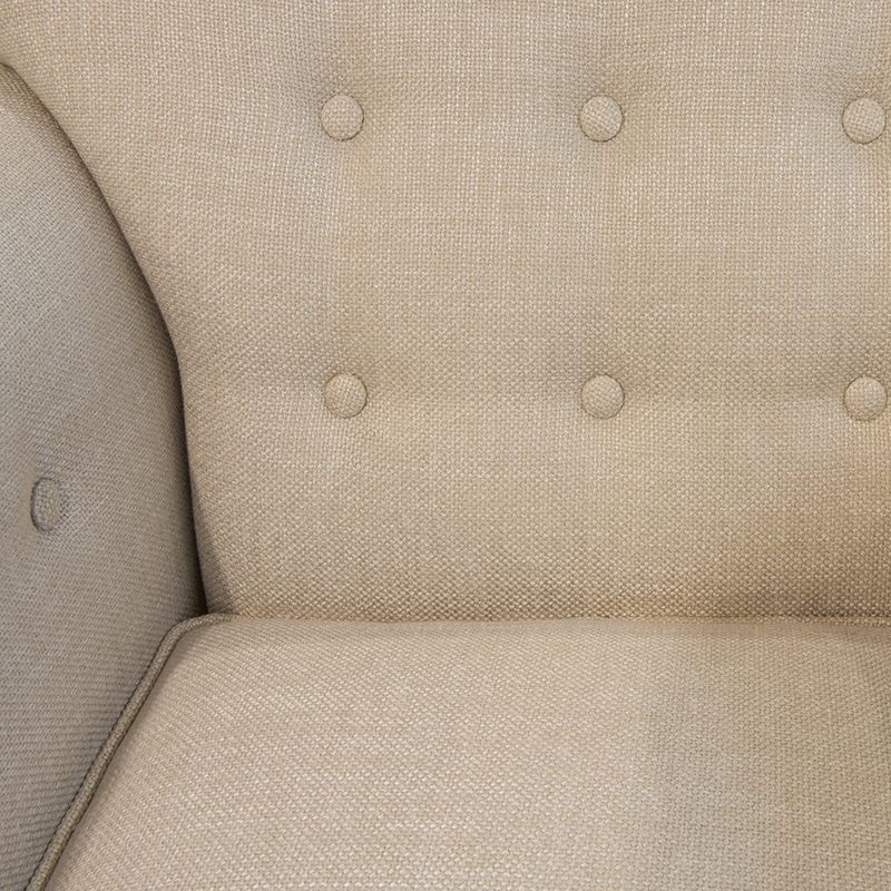 Armchair in neoclassical style. Legs in "Mahogany" veneer. Upholstered with creamy gunny, inner part of the back is decorated with capitone. Structure made of solid wood. Decorative pillow are not included in set.