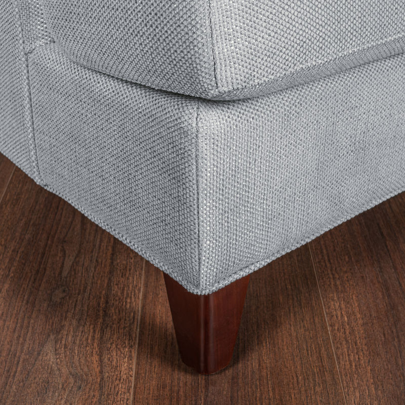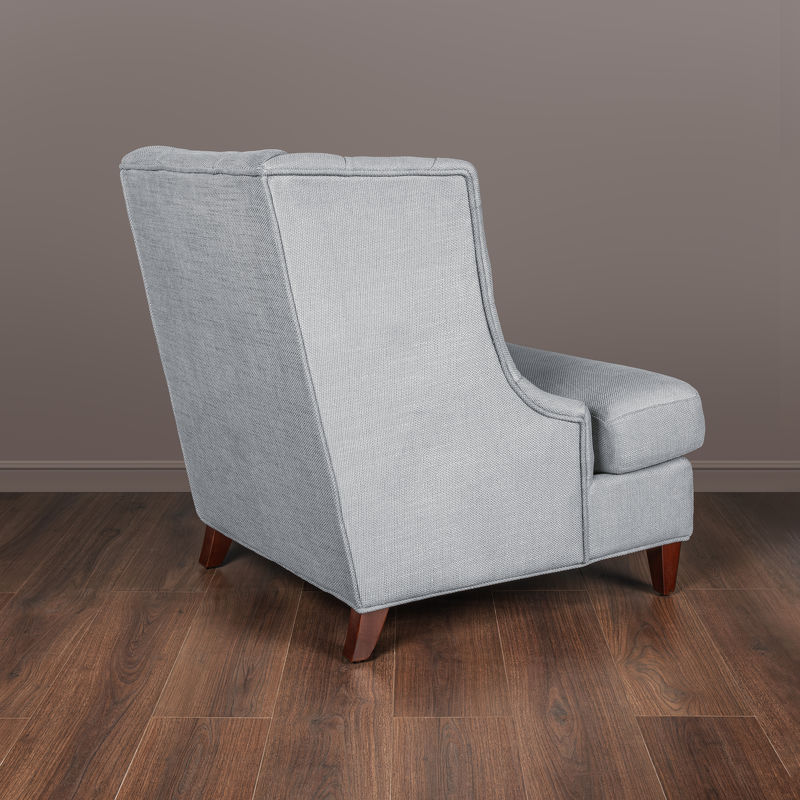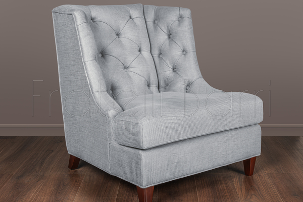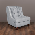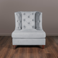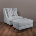 Pouf FB.ST.MES.33 on photo. Pouf is not included in set. Armchair in neoclassical style. Upholstered in grey-blue gunny fabric, back and inner part of sidewalls are decorated with capitone. Legs finished in "Mahogany" B veneer. Structure made of solid wood.