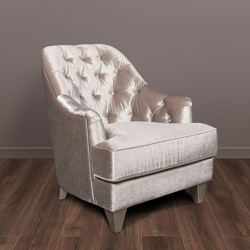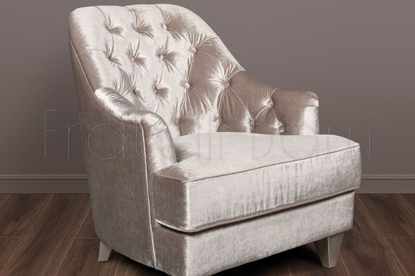 Armchair in neoclassical style. Upholstered in velvet, inner part of the back is decorated with capitone. Structure made of solid wood.