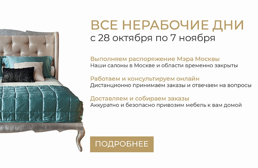 Работа компании в период с 28 октября по 7 ноября Уважаемые клиенты!В связи с распоряжением Мэра Москвы наши московские салоны будут закрыты с 28 октября по 7 ноября 2021 г.В течение всего этого периода наши менеджеры будут в полной мере выполнять свои обязанности дистанционным образом – консультировать вас всеми доступными способами (по телефонам, email, через онлайн-чат и др.), заниматься обработкой входящих заказов и контролировать процессы доставки и сборки заказанной мебели.Оплатить заказы вы можете любым удобным для вас способом: банковскими картами онлайн или при получении заказа, а также наличными курьеру. Заранее сообщите менеджеру о способе оплаты, который вам наиболее удобен.Служба доставки и сервиса также будет в полном объеме продолжать свою работу, доставляя ранее сделанные и новые заказы нашим клиентам.Обращаем ваше внимание на то, что доставка купленной мебели будет происходить максимально безопасно: мы контролируем самочувствие всех наших сотрудников в течение всего дня. Сотрудники службы доставки и сервиса ответственно подходят к личной гигиене, используя одноразовые медицинские маски и средства для очистки рук (санитайзеры).Желаем вам крепкого здоровья и удачных покупок! 27.10.2021
